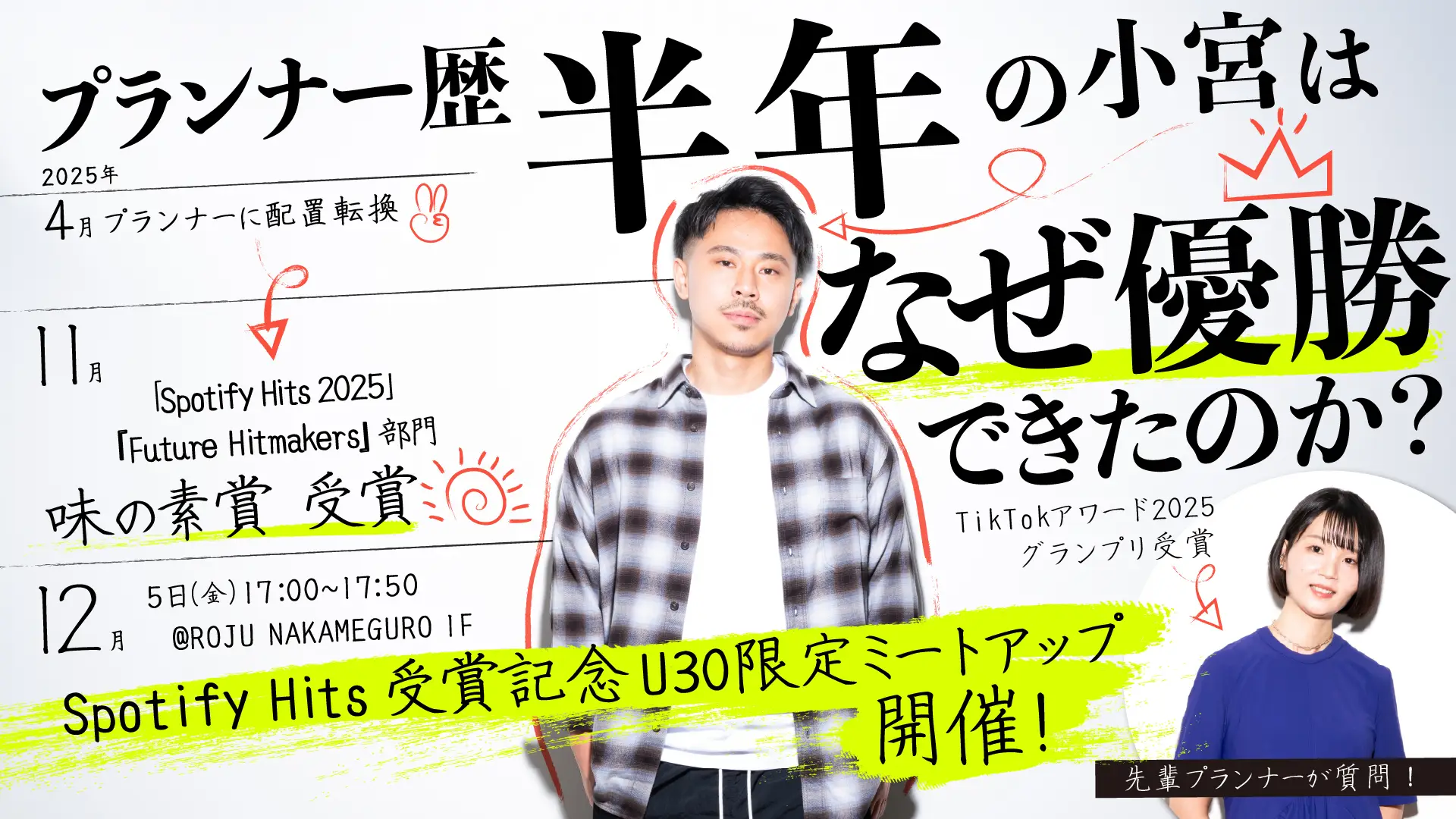 12月5日(金)、クリエイティブや映像制作、SNSマーケティングに携わる方に向けたミートアップイベント「ONE IDEA ミートアップ〜プランナー1年未満の小宮はなぜ優勝できたのか〜」を開催いたします!