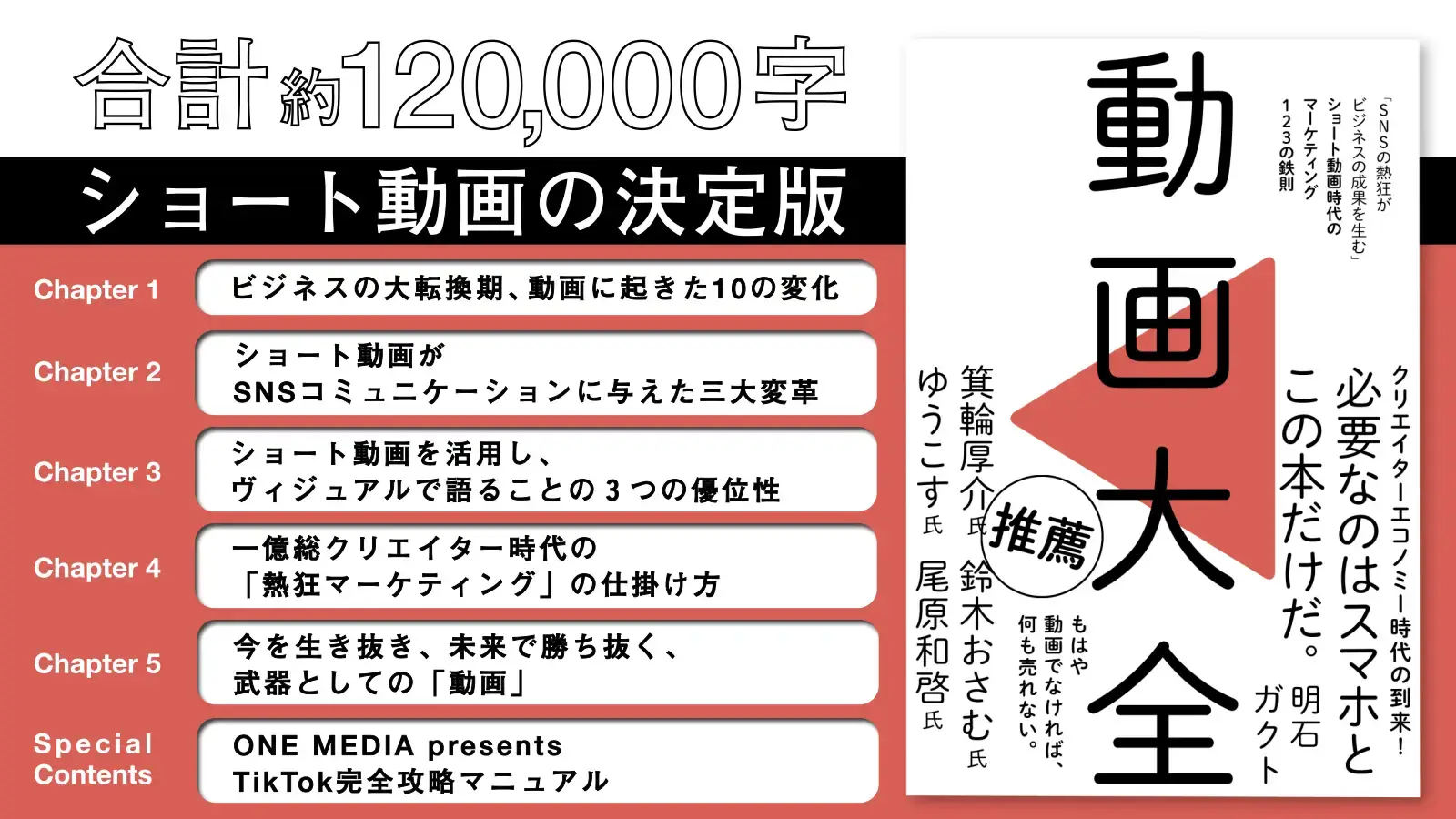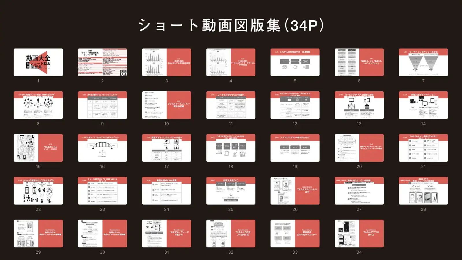 ご参加の方限定でショート動画マーケティングのスキル・ノウハウを全公開した明石ガクト著『動画大全』の書籍内に収録した「ショート動画図版集」を無料でダウンロードいただけます。
