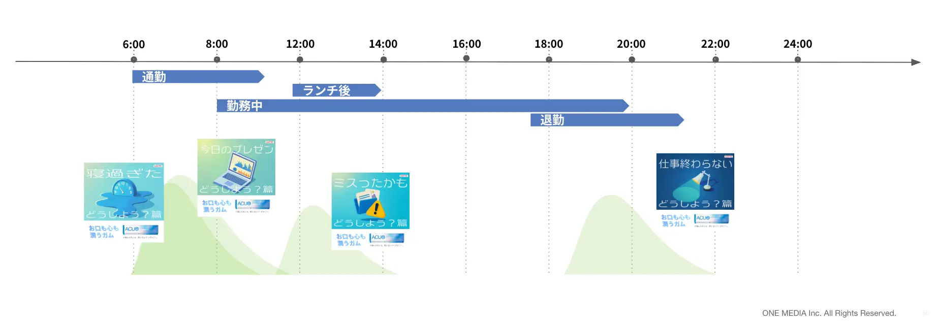 音声広告(Spotify)では、人気声優・下野紘氏をナレーターに起用し、シチュエーション・ターゲティングを徹底しました。通勤中、ランチ後のプレゼン前、残業中など、生活者が実際に不安やプレッシャーを感じやすい時間帯に合わせて、クリエイティブを出し分けています。音声という没入度の高い接触環境を活かし、「不安な時にACUO」というメッセージが自然に記憶に残る設計としました。