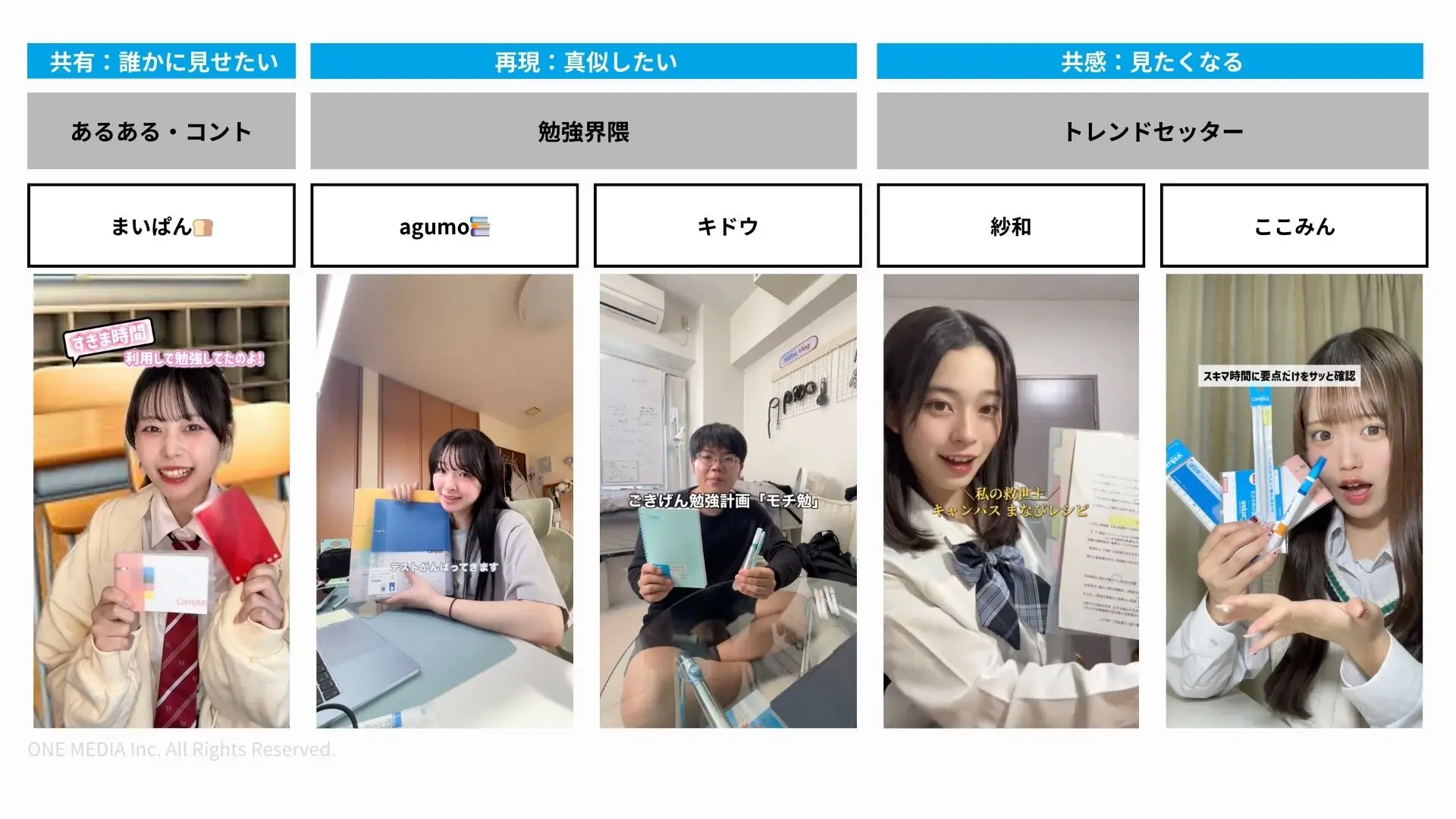 「再現:真似したい」→勉強界隈・ロールモデル: 勉強のルーティンや学習のコツなど、再現性の高い情報を発信するクリエイターを起用。実用的なTipsを提示することで、成績を上げたいという動機づけを狙う。