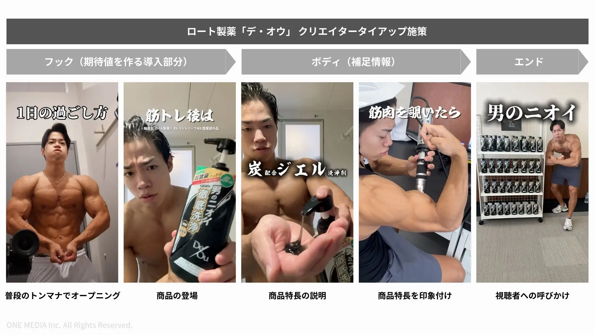 WEB CMによる認識転換を補完する取り組みとして、筋トレ文脈と親和性の高いインフルエンサーとのタイアップ施策を実施しました。ここでは、「トレーニング中の汗は普段の汗とは異なる」という切り口を用い、体臭ケアの必要性をより具体的に伝えることを狙っています。
